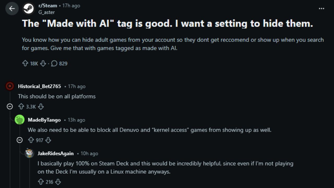 The post shared on the Steam subreddit says “The ‘Made with AI’ tag is good…” referring to Steam’s somewhat recent requirement of all games to disclose the use of AI in game development. This is a disclosure that Tim Sweeney, the CEO of Epic Games, recently said was pointless. This Reddit user, u/G_aster, thinks it should go even further, writing, “I want a setting to hide them.” There were several notable reactions in the comments.