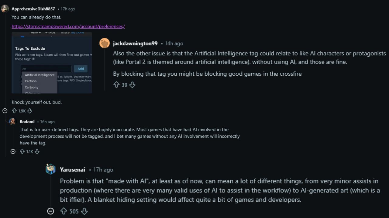 The top, most upvoted comment simply states, “This should be on all platforms.” Clearly, this is a popular sentiment, at least with some portion of the Reddit audience. Another top comment pointed out that “you can already do that” and shared a screenshot of Steam’s preferences page that allows players to add “Tags to Exclude.” But players were quick to point out that this is not a reliable solution. Tags on Steam are user-defined, as a reply points out, “They are highly inaccurate.” This method would likely miss some games that don’t yet have the tag, as well as games that feature Artificial Intelligence in the story or themes, rather than in the game's development. For example, neither ARC Raiders, which used AI for some voice lines, nor Call of Duty: Black Ops 7, which has been accused of using AI art for calling cards, has the “Artificial Intelligence” tag on its store page.