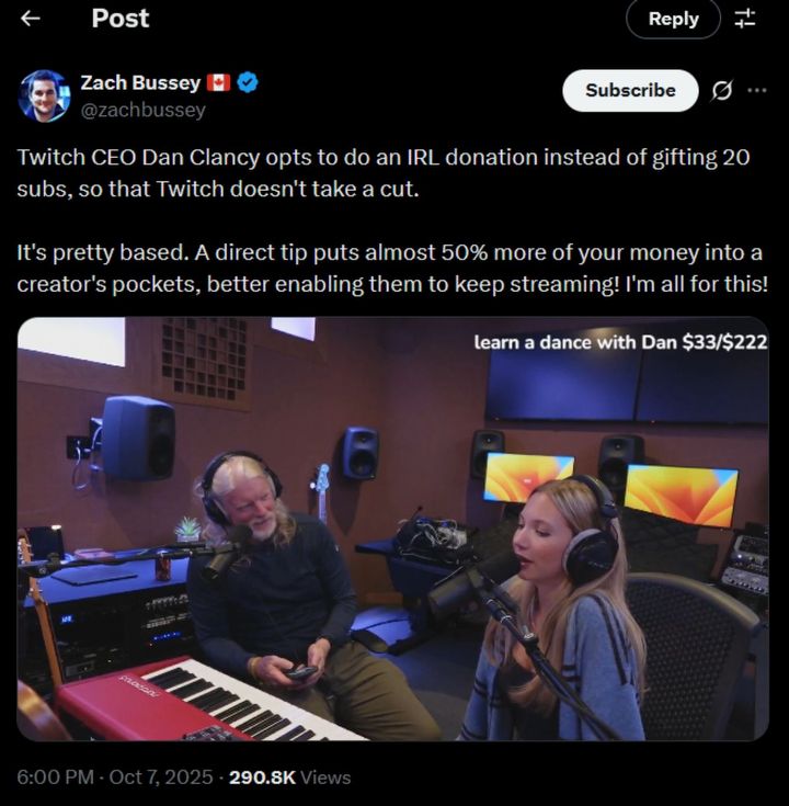 A post on X pointed out, “A direct tip puts almost 50% more of your money into a creator's pockets, better enabling them to keep streaming! I'm all for this!”