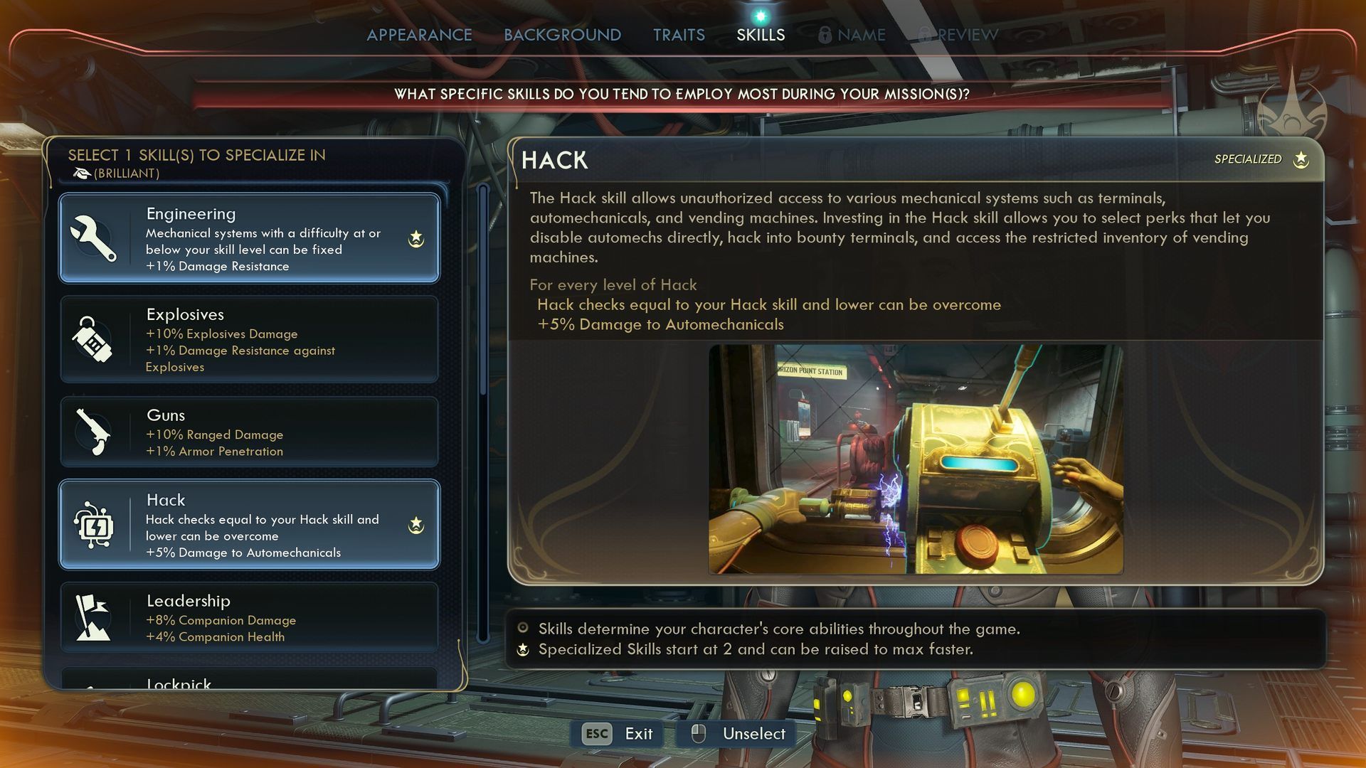 An appropriately high stat will often help you solve certain problems. A high Hack skill will allow you to extract a key piece of information from a computer to complete a mission, Speech will help you talk down an aggressive NPC, and Engineering will help you open a safer shortcut. However, it is important to remember that no character is a master of everything, and some paths will simply remain closed to you. The main goal when building a character should therefore be your preferences and the style that will bring you the most enjoyment.
