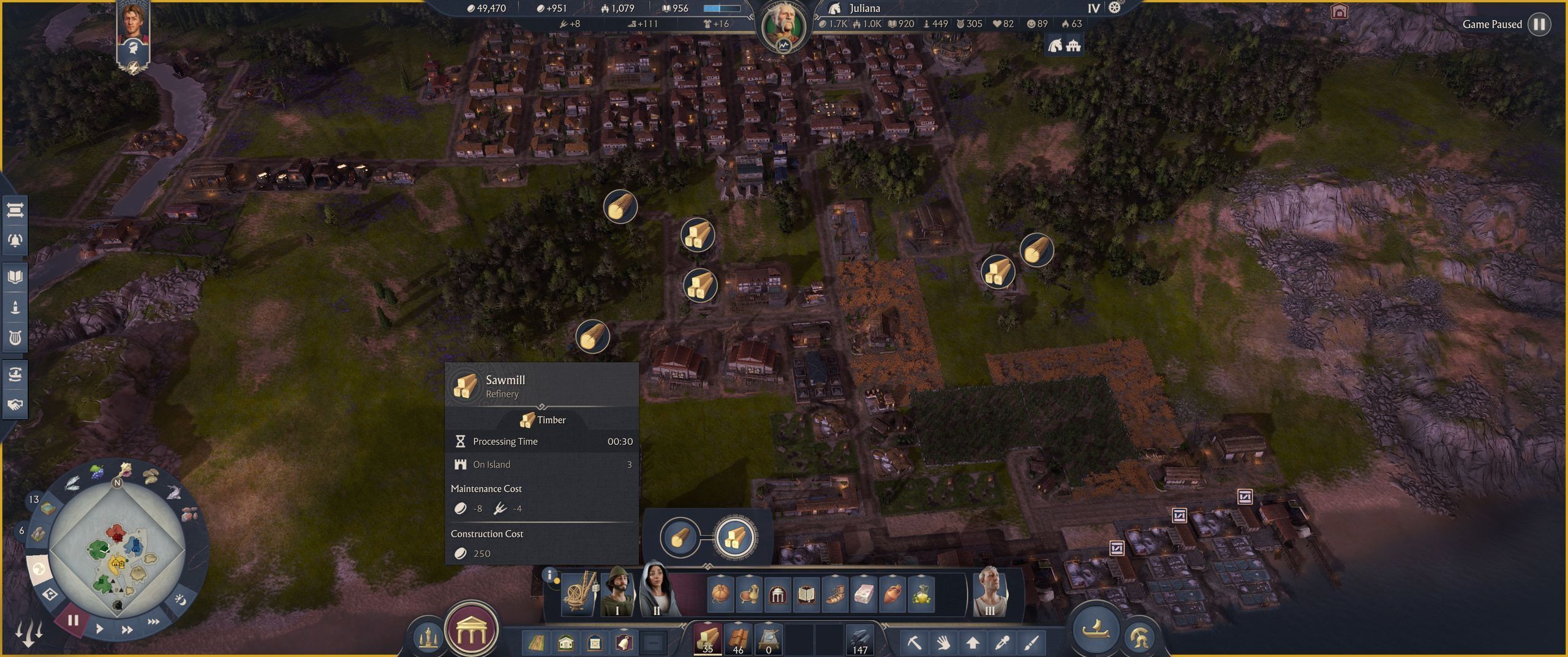 A very important mechanic is the processing time of buildings. Each building operates at a different speed, and producing one ton of a resource takes a different amount of time. An optimal production chain therefore requires considering production time so that buildings always have something to process and no unused resources are left behind. Basic production chains are simple – a lumberjack's hut produces one ton of wood every 30 seconds, and a sawmill produces one ton of planks also every 30 seconds. Therefore, it is enough to build an identical number of lumberjack huts and sawmills for the chain to work perfectly.
