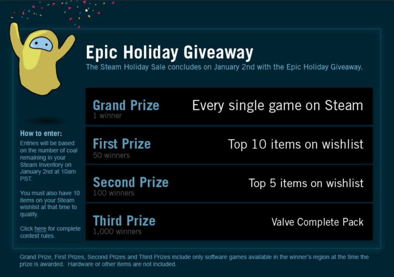 If you saved your coal, you could enter the Epic Holiday Giveaway on January 2. Your entries were based on how much coal you still had in your inventory, and you had to have at least 10 items on your Steam Wishlist to qualify. And the prizes were amazing. You could win a “Valve Complete Pack” or 5–10 Wishlist items. But the grand prize was absolutely insane: every single game on Steam –there were probably only around 2,500–3,000 games at the time.