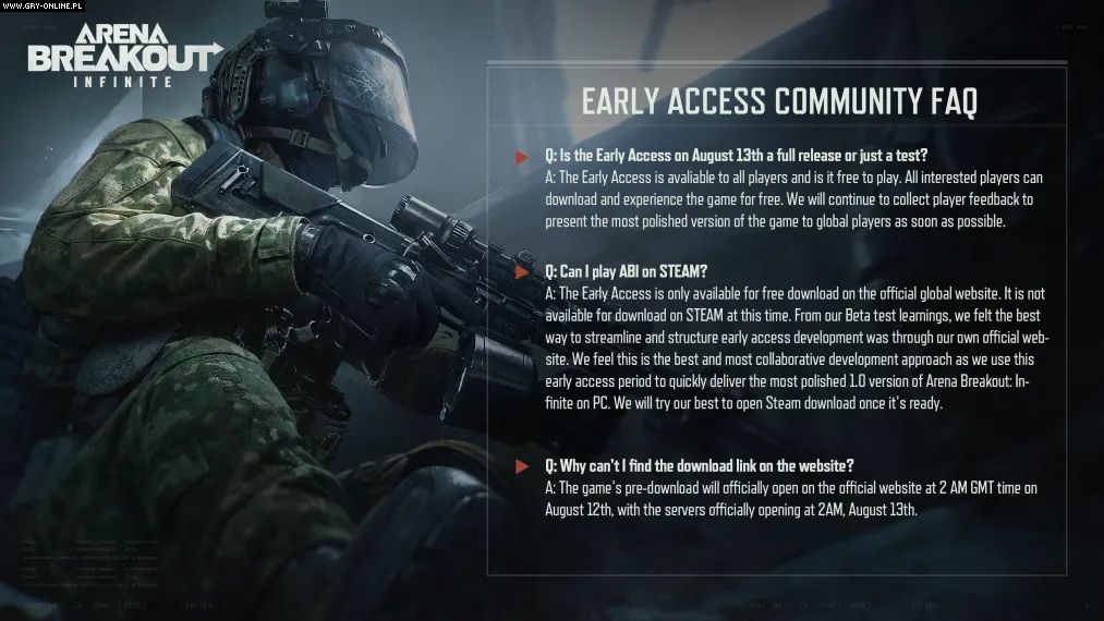 The promising online shooter Arena Breakout: Infinite will be released on PC on August 13th. In this regard, the developers from Morefun Studios unveiled new information about it on the official website and dedicated server on Discord. They discussed, among other things, the issue of early game download or system requirements for the extraction shooter (PvPvE), which could become competition for Escape from Tarkov and Gray Zone Warfare.