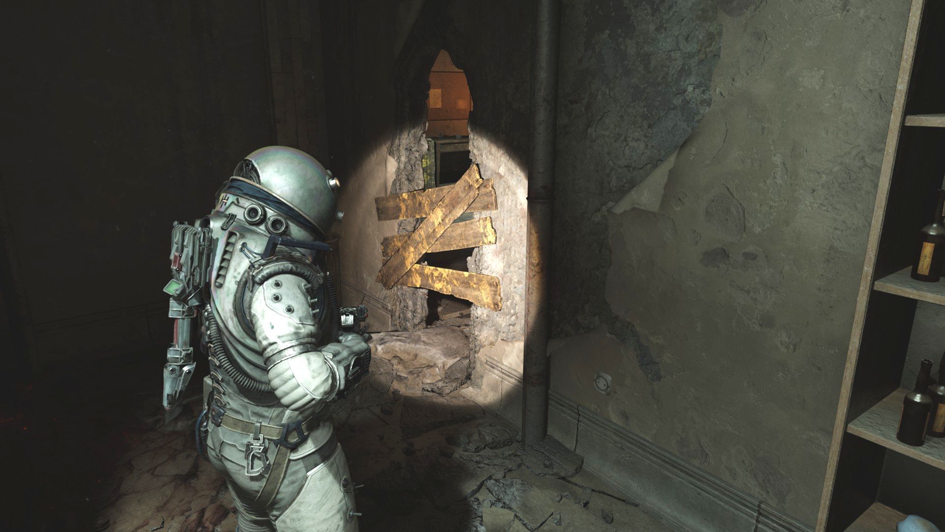 Inside the kiosk, look around for a narrow passage blocked by planks. You can destroy them and squeeze through to the other side.