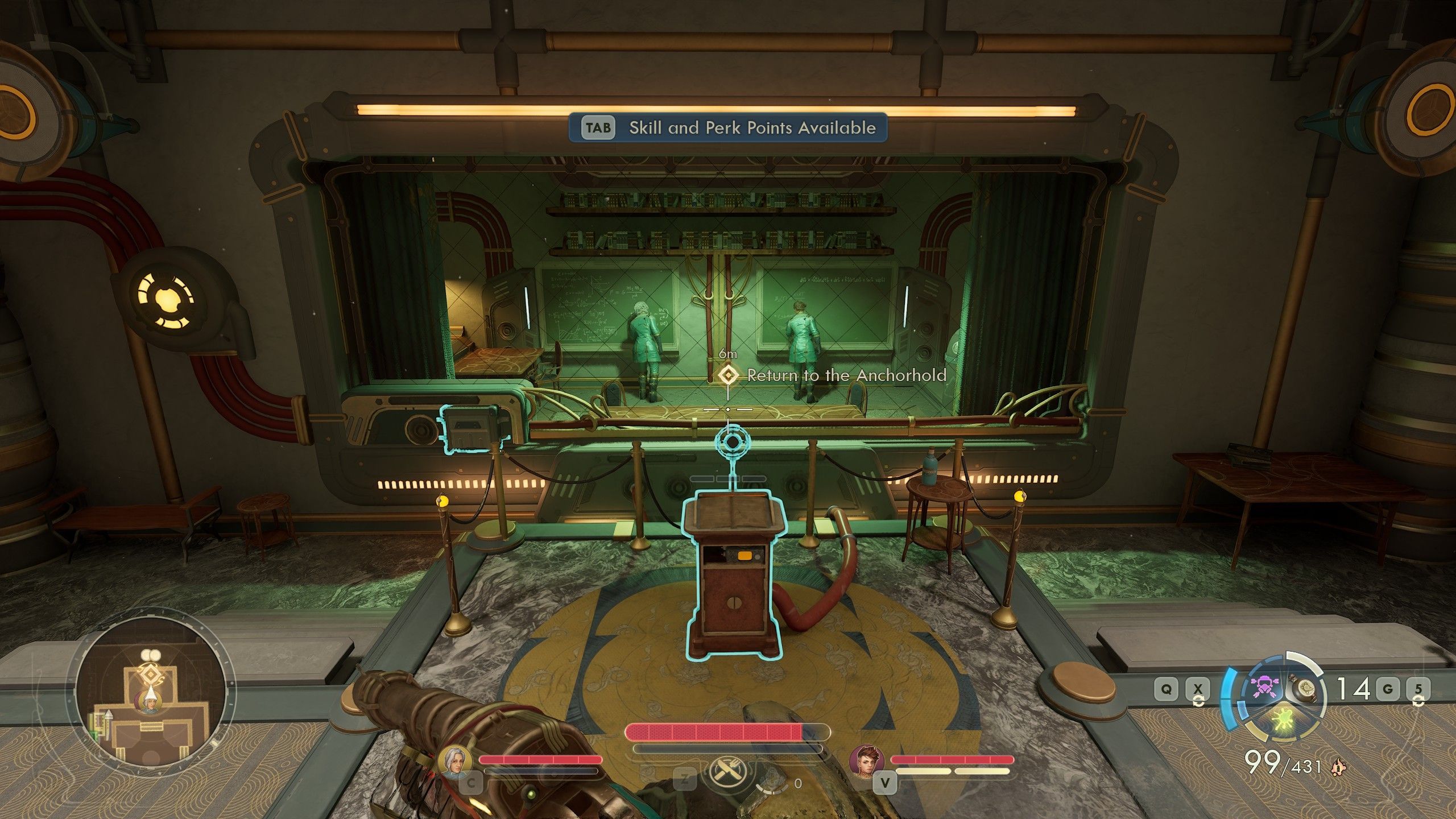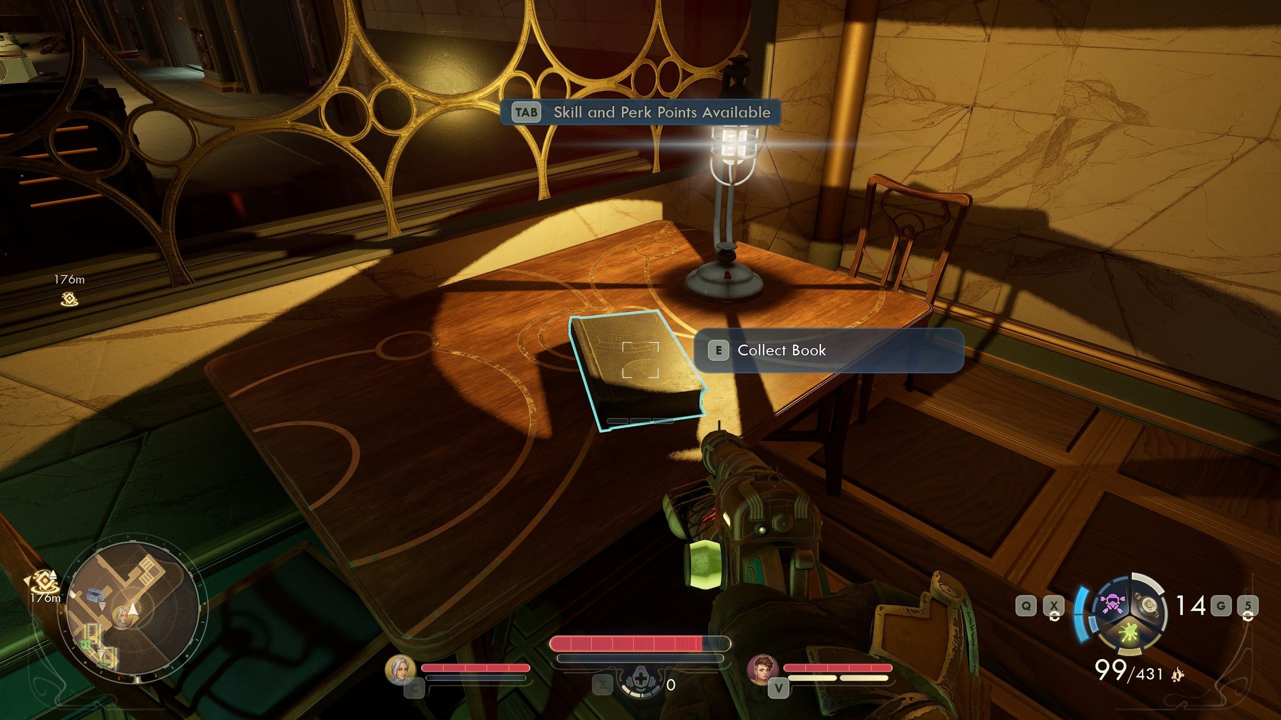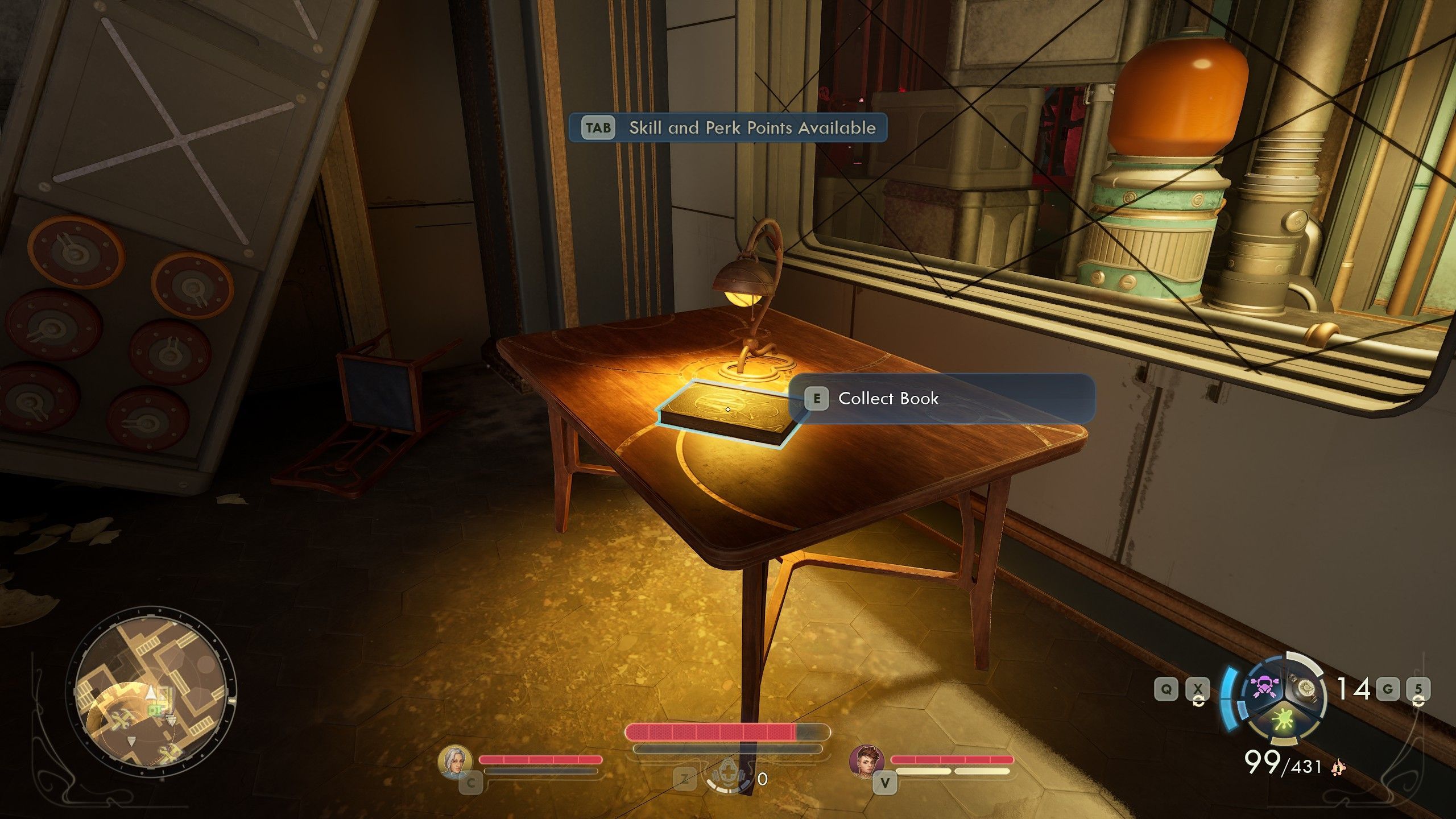 On the table, you will find the first of the books for the researchers. Then, you can restore power to the blocked doors and exit back to the library. The first part of the quest is done.