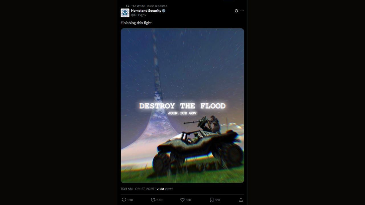 The image posted by Homeland Security shows Master Chief driving the iconic Warthog from the Halo series, with a soldier manning the turret. The text across the center of the image reads “Destroy the Flood,” a reference to an alien threat from the Halo series that parasitizes living or dead hosts and quickly spreads across entire planets. Then, smaller text below gives a URL to join ICE. Homeland Security also added the iconic Halo marketing phrase to the post, writing: “Finish the fight.”