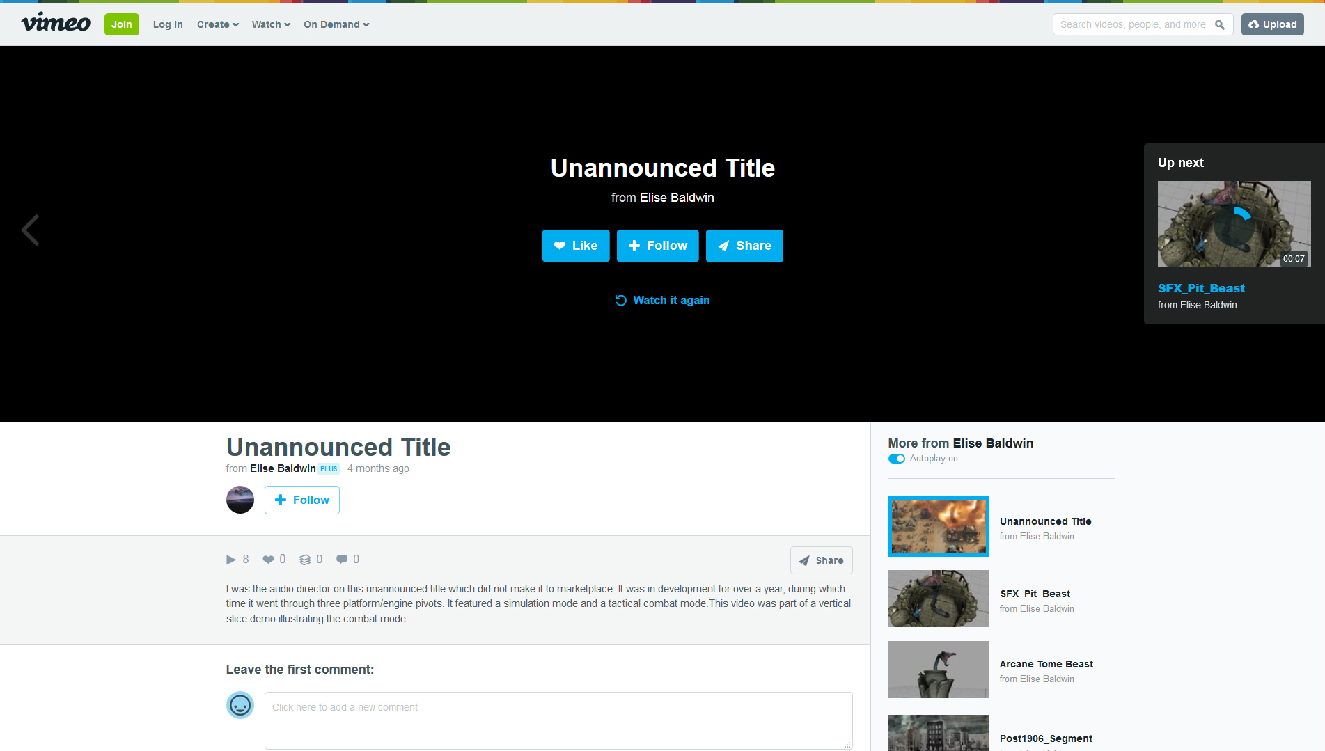 “I was the audio director on this unannounced title which did not make it to marketplace. It was in development for over a year, during which time it went through three platform/engine pivots. It featured a simulation mode and a tactical combat mode.This video was part of a vertical slice demo illustrating the combat mode.”