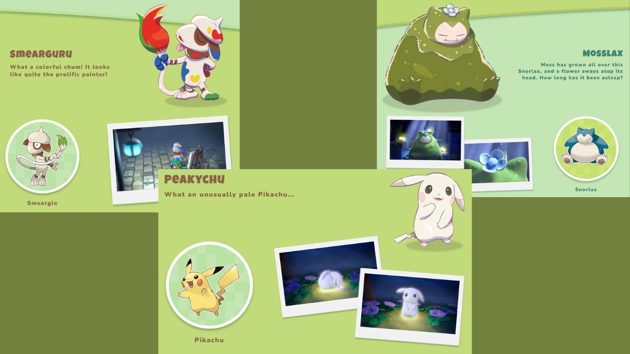 The end of the trailer revealed three potentially new Pokémon forms. First, a Smeargle covered in splotches of colorful paint. Then a pale, ghostly Pikachu with droopy ears, and finally, a Snorlax covered in moss with a flower growing from its head. According to additional information shared on the Pokopia website, this particular The Smeargle is called Smearguru, while the Snorlax is called Mosslax, and the Pikachu is called Peakychu. The website shares additional details about these Pokémon but doesn’t reveal anything about new typings, abilities, or how they will work in the game.