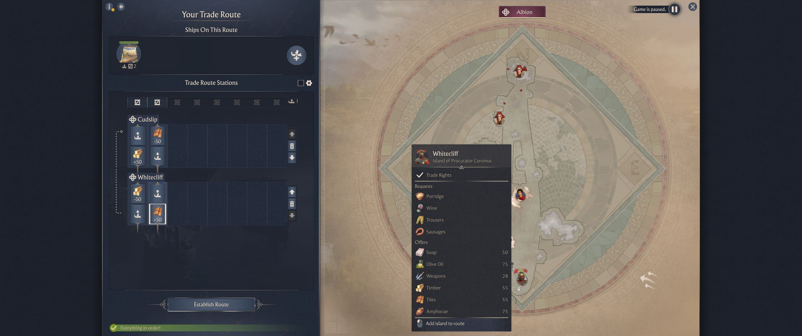 Trading goods between your controlled islands is free of charge. However, you can also use the routes to trade with allied or neutral islands. First, you need to sign a trade agreement with them, which you can do in the diplomacy menu. These islands offer only specific goods for sale, and acquiring them will cost you money. Delivering your goods, on the other hand, will earn you money. Each of these islands also has several needs, meaning goods for which they will pay you extra.