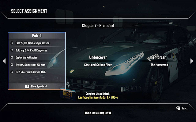 All three lists from this career level are very demanding and can take you even up to few dozens of minutes. If you want to choose Patrol or Enforcer list, use the police car which is good in catching racers. In case of the Undercover list it would be best to choose a fast police cat because you'll have to break several speed records.