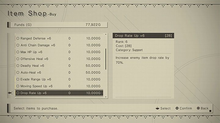 - Chips from the Drop Rate Up group - After you install the chip, it will increase your chances of finding items dropped by the defeated opponents. If possible, purchase the best version of this chip (in the example from the second picture it is as much as 6 with an chance increase of 70%). Even if the enemies will leave unnecessary things behind, you can always sell them.