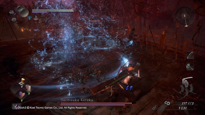Hachisuka Koroku's combat style doesn't differ much from the moves familiar to the player who uses kusarigama. His attacks are very fast, and they have a great range. This boss can perform two attacks, or jump, strike with his weapon and then perform a second attack.