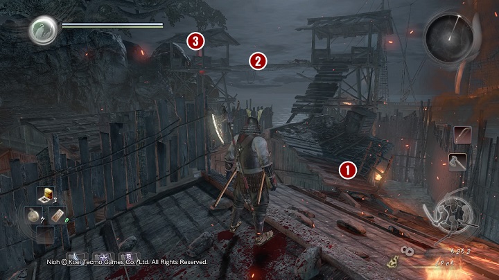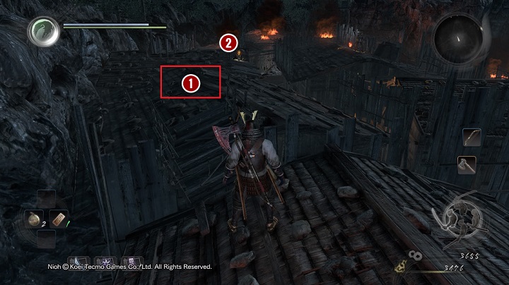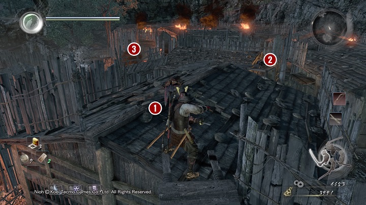 The roof on which they stood is broken which means that if you got on it, you would fall down and land right in front of a heavy armored samurai. Watch your steps and avoid the wooden part in the center [1]. Your task is to unlock the ladder on the picture above [2] which opens the shortcut. It allows you to save the time running on the roofs. When you activate the ladder face the opposite direction [3]. There is another area with a Yoki. When you go near the catwalk the Yoki will appear. You can fight with it on the roof or jump down near the ladder and finish the demon there. You can also jump down, wait for the demon to follow you, then use the ladder and pass the catwalk. The demon stays at the bottom for some time but you shouldn't wait too much because Yoki goes back where it was before and you must fight with it.