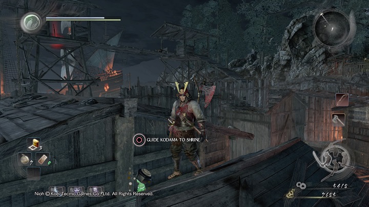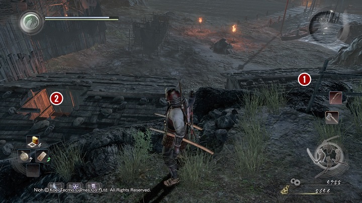 The ship's surroundings consists mostly of two buildings and the bridge that leads to the boss arena. Here, you can encounter patrolling warriors, near the house on the right there is a samurai with a spear [1] and two warriors near the ship. One of the buildings has a broken roof [2] and inside of it there is Yoki. You can't open the door from the outside -in worst case you have to fight in a small arena or perform a suicidal run in order to open the door. If the door are open, remember to kill the nearby enemies first.