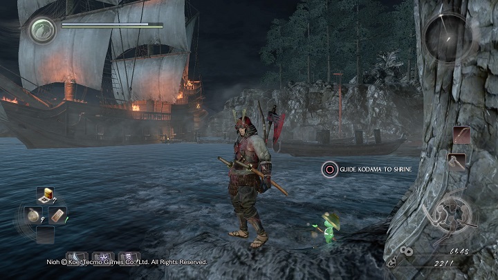 On the shore you can find another Kodama. If you followed the hints than this ghost should be the ninth and the last one in this mission. When you are done go to the gate. When you are in front of it, turn right and go down the side path.