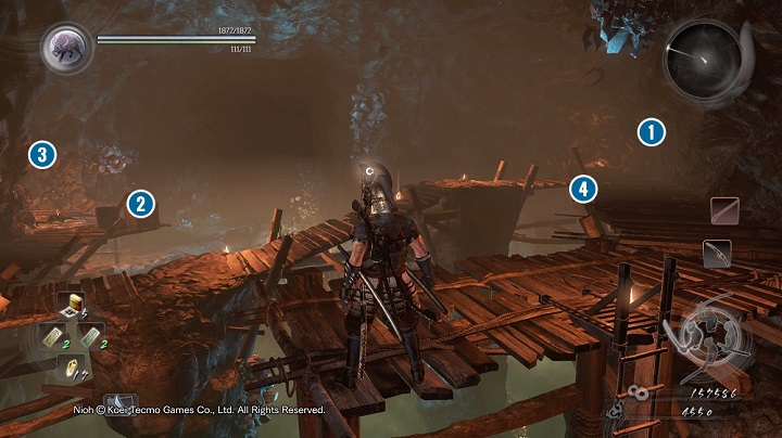 Notice the above picture. At the end of the corridor on the right you will find a door [1]. Previously it was locked when you attempted to open it from the other side. Remain up and go to the place marked on the picture [3]. You should unlock one of the ladders on the left on your way. Later this will allow you to use it. Under the chest [2] there is another Kodama hiding. After you send him to the shrine and try moving forward, bats will throw you down. Explore the area behind the mentioned corridor and keep going down. What's interesting, if you jump from the scaffolding in a carefully selected point [4], you will reach the scaffolding below. Another Kodama is hiding there. You should do it after all nearby opponents are eliminated.