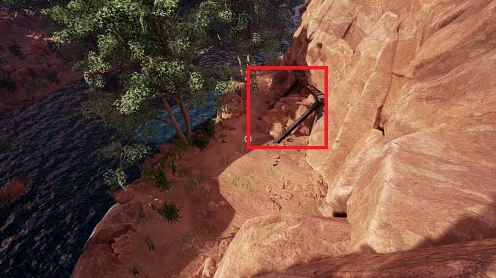 To complete the next goal, you need to find the cart and drive it to the scrapyard. Just before its gate, there is a junction, with one road leading to the scrapyard, and the other one to a chasm. Take a look on the above screenshot. Your target is to destroy the marked pile of stones. This means that you have to turn the cart in such a way, so the emitter is set in the direction of the cliff. Then, all you have to do is target the obstacle.