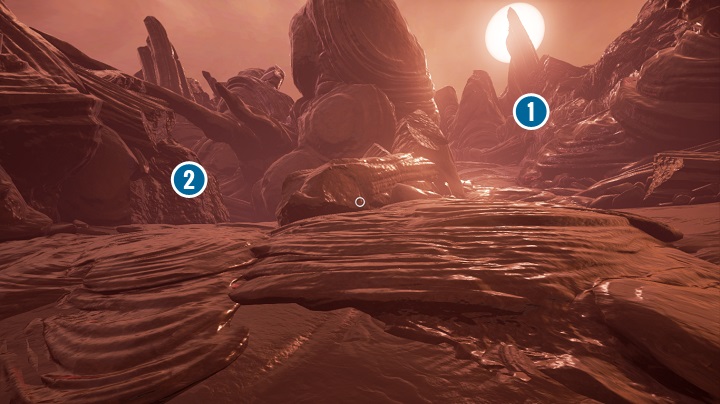 When you get past two big rock columns, you will see a junction on your left (visible on the screenshot). Go forward [1], head this way for a moment, and then turn left to the hill. If you reach the top, you'll receive a Steam achievement. Once you get your reward, return to the junction and turn right (from the side of the hill) [2].