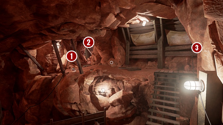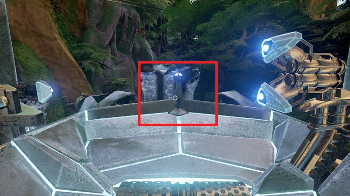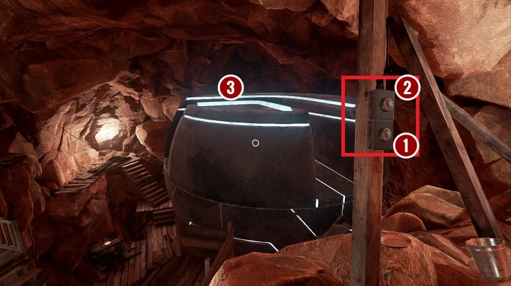 Right now you're in a cave, which you've seen in the previous chapter. Mind the fact that after the teleportation from any of the circles, you'll have four ways out. This means that regardless of how you have turned the structure while in cave, you'll be able to enter it in every case. A good way to compare the position of the structure to the starting position is the teleporting device. Remember the position of the main button before you make any use of the tools in the cave.