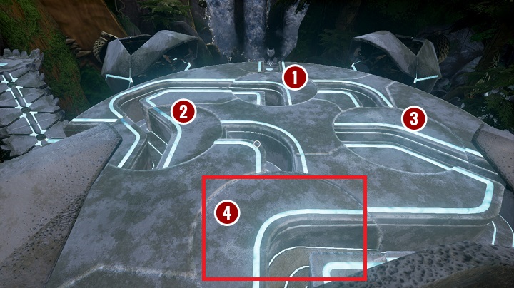 In further analyzing the maze's mechanics, we will use this picture. This is still the starting position. Four circles have been highlighted here [1,2,3,4]. Underneath every of these circles is a teleporting device. In order to get to them, you have to turn the whole structure in such way, that the highlighted circle is in the middle. Then, after taking the elevator down, you'll be able to use the teleport and get to Hunrath, which you should do now.