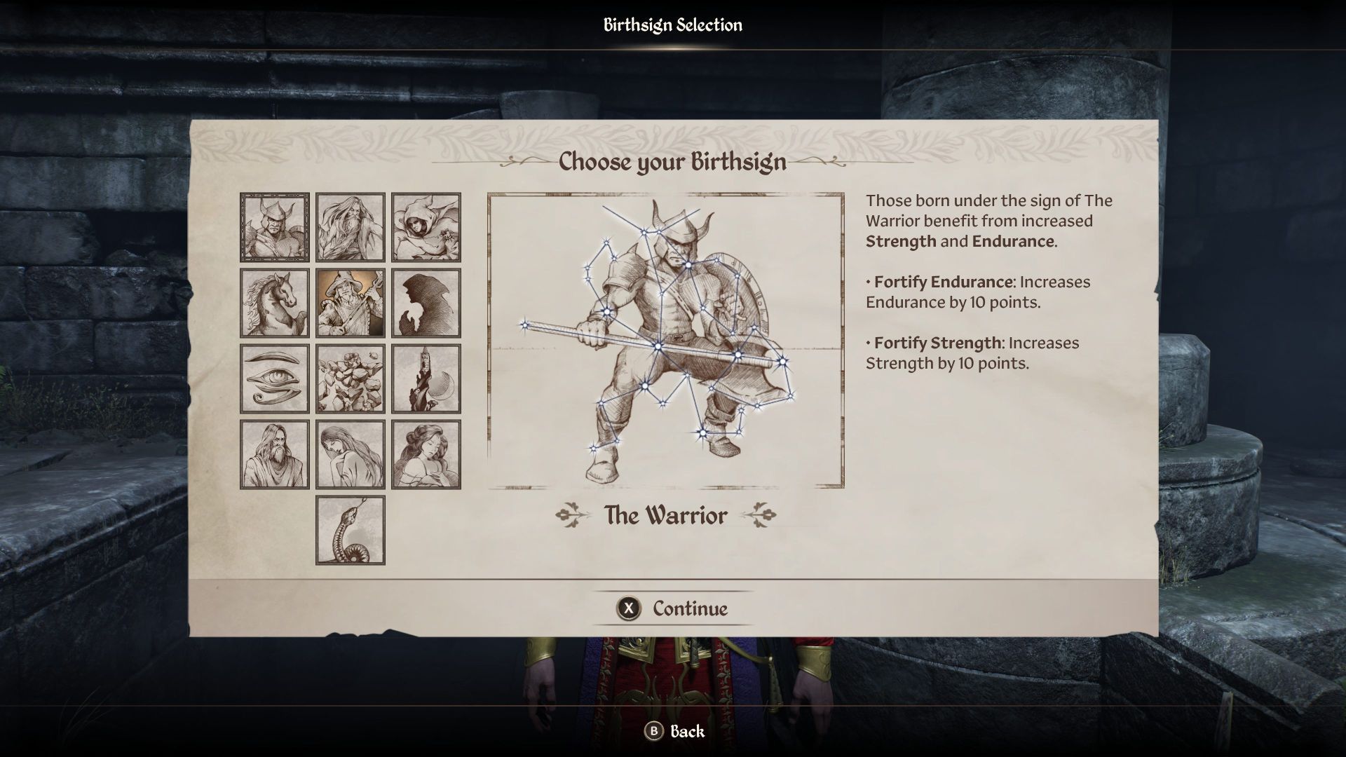 - Available Birthsigns are The Warrior, The Mage, Thief, The Steed, The Apprentice, The Shadow, The Ritual, The Atronach, The Tower, The Lord, The Lady, The Lover, and The Serpent. Depending on your choice, you may receive a specific permanent stat bonus (e.g. increase the Strength attribute by 10 points) or a unique skill (e.g. invisibility or being able to paralyse an enemy). Skills associated with Birthsigns may have a limit of 1 use per day.