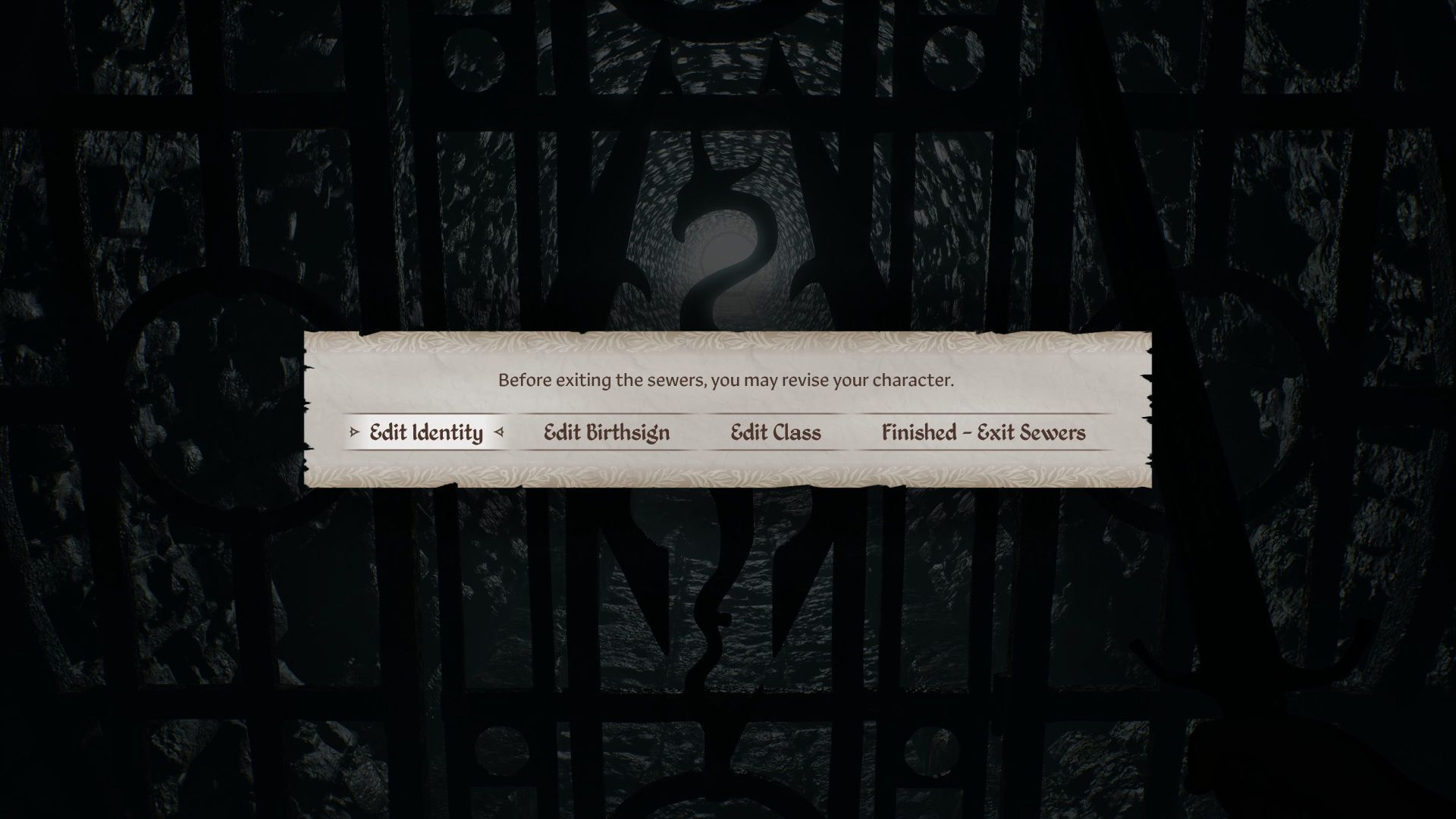 - Finished - Exit Sewers - This confirms that you have exited the sewers and your choices will become final. In the game world you will not find any unique locations, mechanics or NPCs to change the race, origin, gender, birthsign, class or appearance.