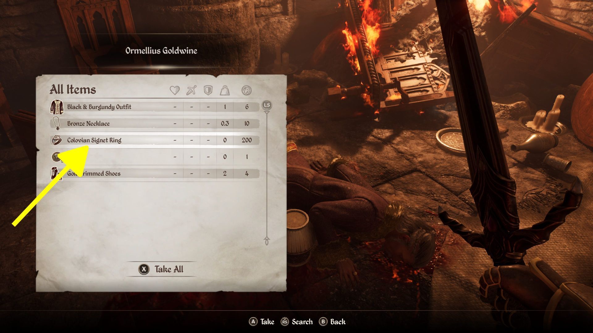 - Search the corpse to find the Count's signet ring (the picture). This is an important quest item that you must take with you.