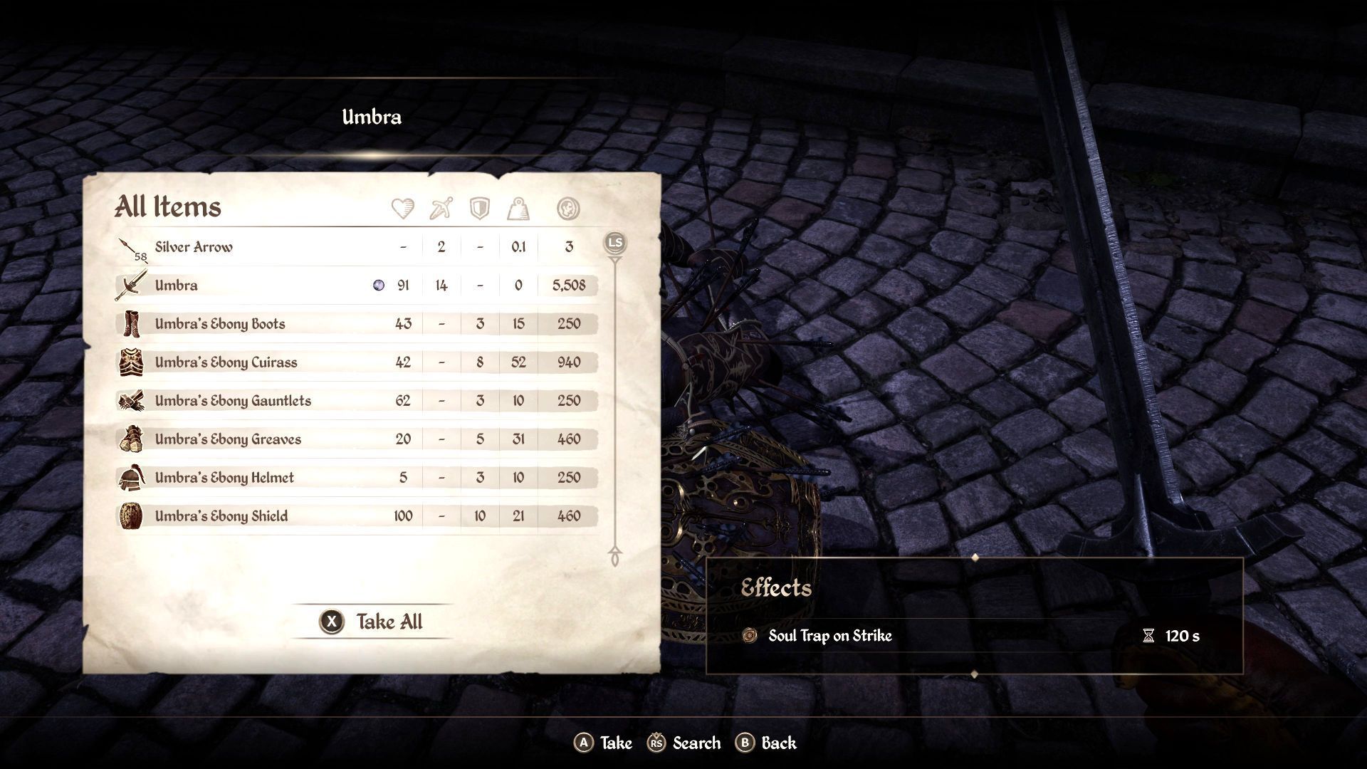 - The Umbra sword and armor set are high quality items with appropriately high stats. They can be especially useful for a warrior who fights at close range and uses heavy armor. Alternatively you can sell them and make a lot of gold.