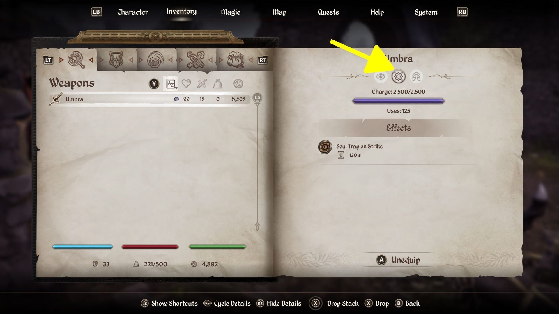 - The enchanted weapons in Oblivion have a limited number of charges, and once they deplete, you can only deal standard damage with them. You can check the charge status of an enchanted weapon in your inventory. Find the weapon on the list, select the option to show details (press R3 on the controller) and go to the tab marked with a star icon (marked in the attached screenshot).