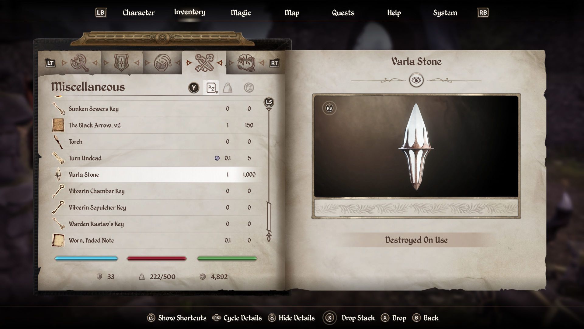 - Using a Varla stone is also a great technique to recharge an enchanted weapon (example in the screenshot). This action allows you to fully recharge your weapon, so it is best to use it only after all charges have been depleted. You can find Varla Stones in elven ruins along with other loot.