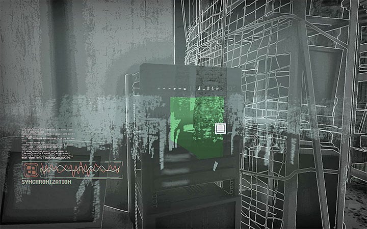 The main character is still in the apartment block. The forest is only a highly advanced hologram, and you will be consolidated in this belief by the waves which will bend at regular intervals, making it possible to see the distribution of rooms and corridors in your current location for a short time. Your task is to reach the green boxes, similar to the ones shown in the picture above. Once you have located each of them you will need to pull them out, since they are in reality holo-chips. Locating and pulling out all three devices will allow you to "return" to the apartment block.