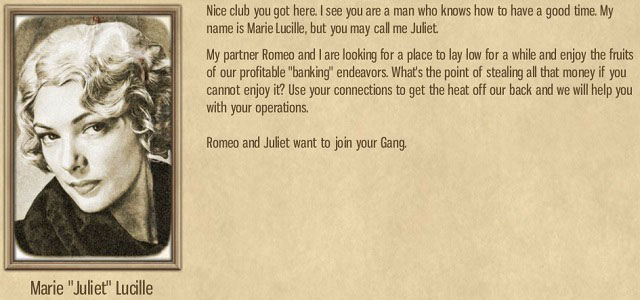 The next thing you should do is to complete the remaining objectives. You can obtain both Beer and Liquor (by trading through Jobs), build a Hotel (though it's a very expensive option and it's better to leave it at the end) or take out a rival gang. The forcible solution is the easiest, so do it. Gather the required amount of alcohol and give it to the club. If you're lacking cash, take some Jobs and exchange small sums of clean money for large sums of dirty money. In the meantime, your gang will increase in numbers by the addition of Romeo and Juliet: Will Patterson and Marie Lucille.