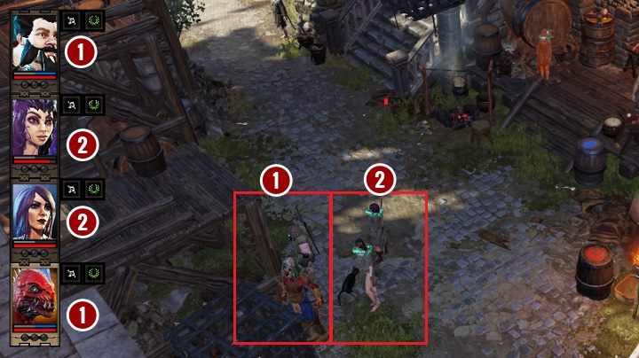 Assuming that there are four heroes in the party, you can place them in any formation, depending on who you want to place at the front. The currently controlled hero [1] will always be at the front - you can see the marked portrait on the screenshot above. The second leading hero is the character whose portrait is on the top in the left upper corner of the screen [1]. Regardless of whether you are controlling him, or he is only following the rest of the party, he will always be in the first line. The remaining character always places themselves behind the first line [2].