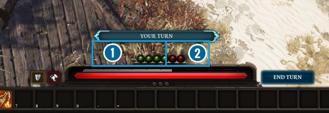 The action point bar has three colors. Black color marks the blocked points - our character can have that many points to use, but currently haven't developed the adequate skills. Green color marks all action points available for the current turn [1]. If, for example, we decide to use a spell, after clicking it, the green points marking the action points will change to red [2]. This way, we can easily verify how many action points need to be spent on completing the action, and make a decision.