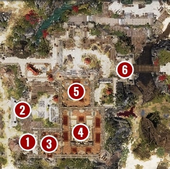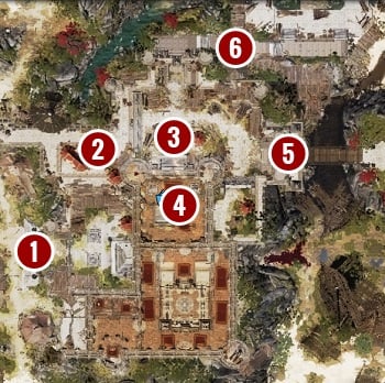 If you feel confident, you can engage guards at the main gate [1]. They have some powerful skills, so don't challenge them if your team didn't reach at least level 3.