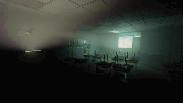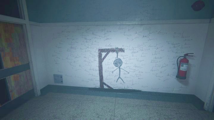 In one of the classrooms, you will find the slide on which schoolgirls played hangman. Having seen it, move in the opposite direction. Go right and straight on. Pass the corridor with the lockers and enter the classroom with the projector. Move it so that it highlights the hangman drawn on the board.