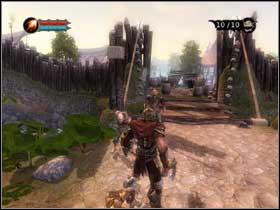 When you're ready, turn the wheel on the right side of the gate (#1) and come on in. Watch out for the butcher cook coming - one is not a problem but soon you'll meet quite a company of them. Walk past some sacks and you'll find mana pit (#2). Pass by some more junk, walk down the stairs and prepare for battle!