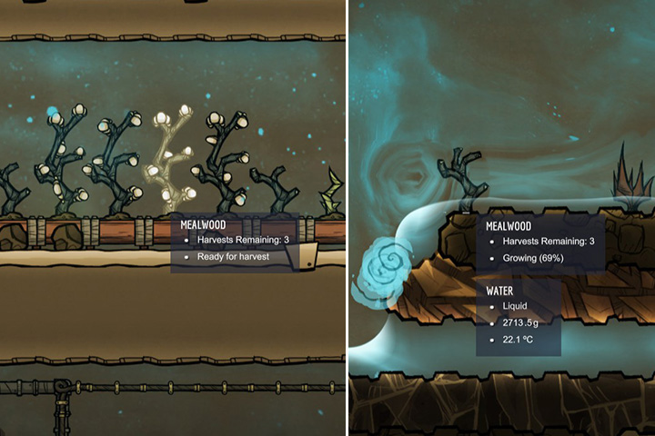 Mealwood. A strange plant that grows "living" and moving seeds. It is the most common plant. You can dig it up and sow it in planter boxes. It needs about 5 cycles from when it has been planted to mature. It is necessary to have a suitable temperature, around 20-30 degrees. After harvesting, it takes about 2-3 days for it to be harvestable again. You can harvest crops 3 times from one planted seed. Each harvest will yield 8 or 16 Meal Lices, and equivalent of 800 or 1600 calories. A drawback is the fact that the quality of this meal is very low, only -3 (grisly). You can create a slightly more caloric meal using 500kcal of meallice and 50kg of water in a machine called the Microbe Musher. This will enable you to create a Lice Loaf meal, with twice the amount of calories, 1000 kcal, and a bit better quality of -2 (terrible). If you've got enough water, you should invest in this Food.