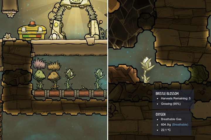 Bristle Blossom. A rarer plant, which produces nutritious fruits. You can dig it up and plant it in your base. It needs cooler conditions than Mealwood and also a certain concentration of any gas. It takes as much as 10 days for the plant to produce the first crop. After each harvest, it takes 2 days to produce another fruit which is worth 1600 calories and has a quality of -1 (poor). A significant advantage of this plant is the fact that it can bear up to 5 fruits before it needs to be replanted. You can also use the fruit to create a less caloric meal, which will have quality improved by one point. Namely the Gristle Berry, prepared in Cooking Station.