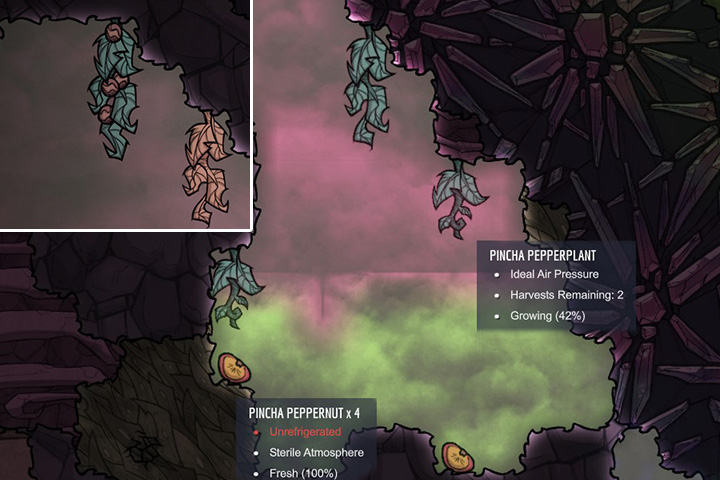 Pincha Pepper. It's a somewhat unusual crop that is inedible by itself. When combined with other types of food however, it can be used to make delicious, quality meals. It prefers high temperatures, between 35 and 85 degrees Celsius. Maturation period is long; it needs 25 days before it can be harvested, and 20 more cycles before next harvest. You can harvest it up to three times, each time collecting 4 or 8 Pincha Peppernuts. The fruit is required to bake various other meals, such as: BBQ, Pepper Bread, Stuffed Berry. While they do not have the best calories to time and effort ratio, they offer better quality, which may help in relieving stress and meeting the requirements of some duplicants. The plant also provides a +15 bonus to Decor.