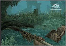 You'll reach a broad terrain full of dinosaurs (small ones). Throw the spear with the fish into the terrain (thanks to that, you'll see where it lands) and take out a gun and shoot them all, when the dinosaurs run around it (before you throw the spear, don't pick up the ammo that lies there, because you'll lose the fish and there are only two in the pond). If you need to, repeat this.