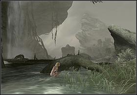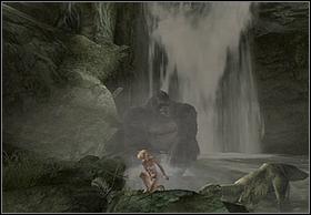 When you get to the top, you'll see Ann hiding behind the root. Move ahead, get ready for attack of a few dinosaurs (although you don't have to fight) and climb the waterfall down. Pick up Ann from the rock there...