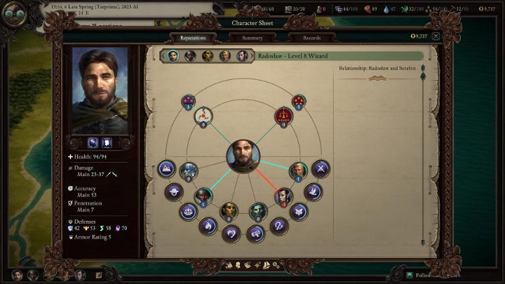 The picture above shows reputation of a main character. Here, you can learn about relationships with factions and companions. Your every choice has impact on them - dialog options, ways of solving quests or your attitude towards a member of a faction.