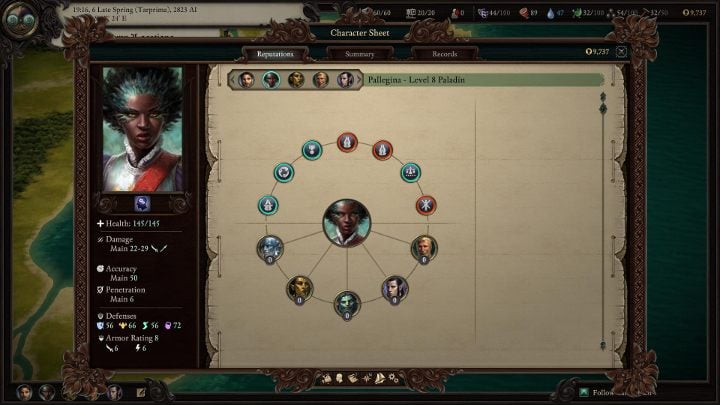 This is how "Reputations" bar looks like for the rest of your party. Here, you can see their relationships with other members of the group and their set of Dispositions - which behaviors they value and which aren't tolerated.