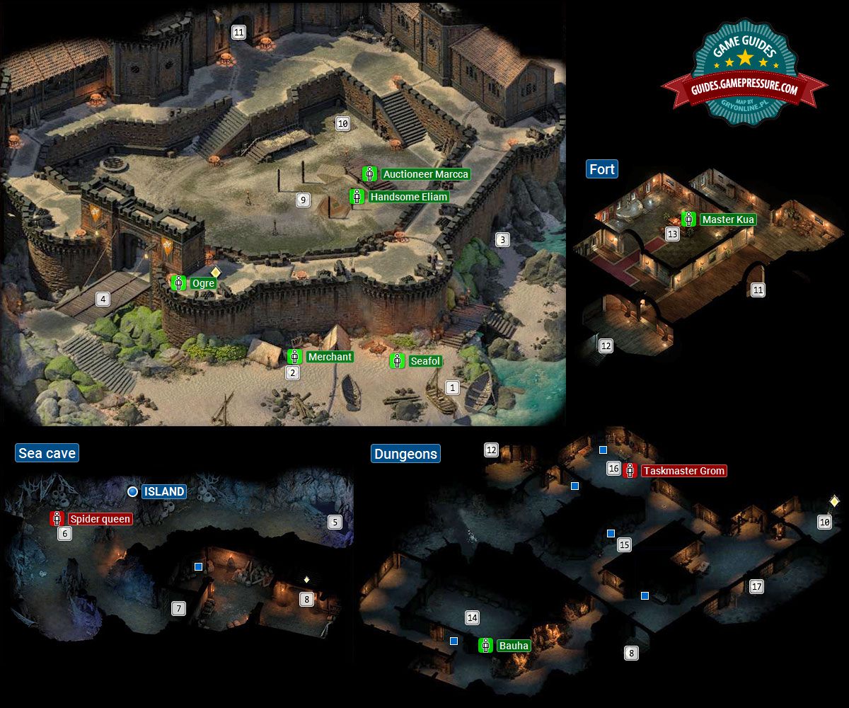 Traveling around the island is difficult, because unauthorized people do not have access to selected parts of the fort. After arriving to the island, try first of all, correctly conduct a conversation with the ogre at the drawbridge (M37,4), i.e. confirm your participation in the slave auction. This will unlock your access to the auction site and in addition, thanks to the meeting with the auctioneer Marcca (unlock the quest A Shrewd Proposition earlier in Dunnage), you will be able to enter the fort and reach the office of Master Kuy (M37,13).