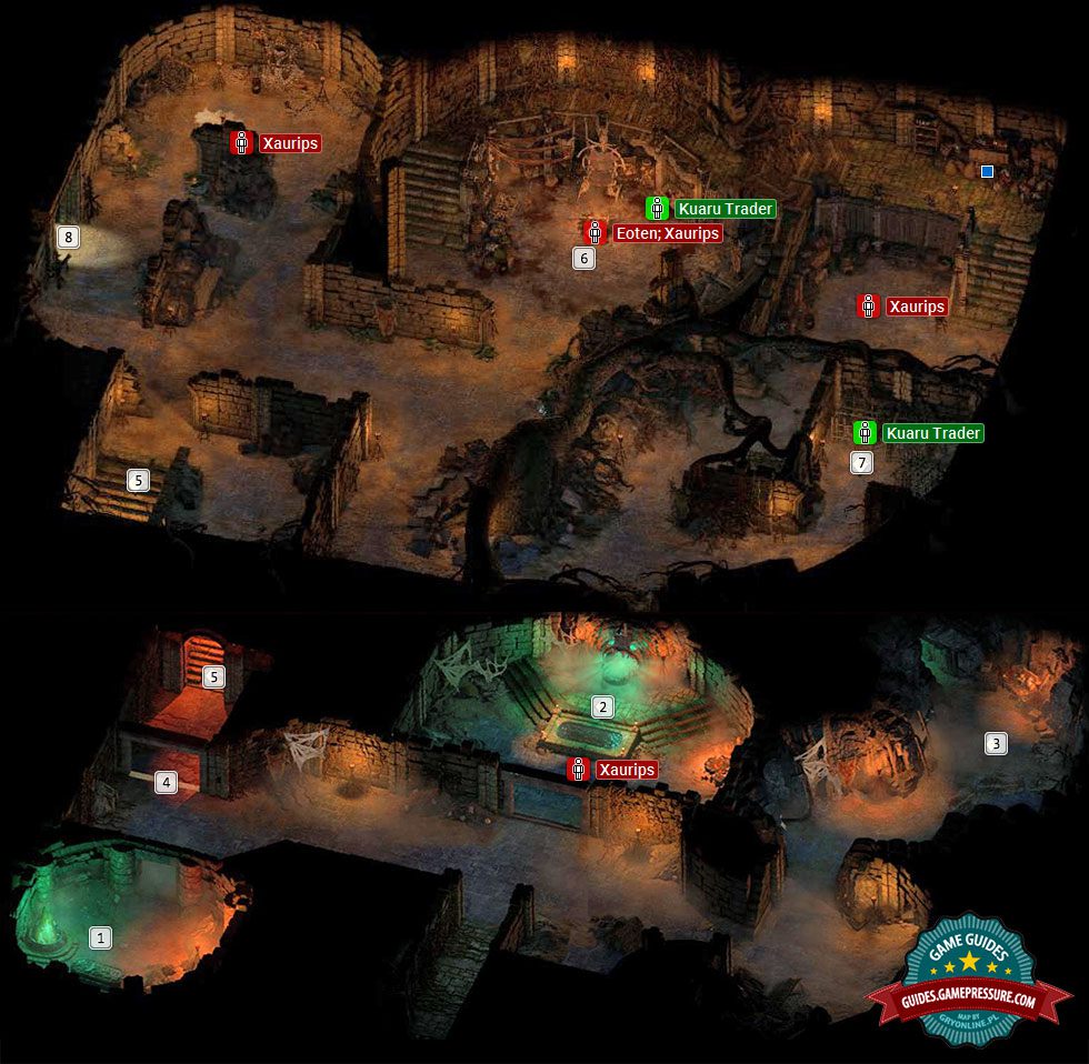 The map above depicts Pahowane available in Pillars of Eternity 2 Deadfire. These undergrounds can be accessed during Skipping Ahead quest which can be received from Flaune Elette in The Sacred Stair (M14). The location is full of Xaurips. Your goal is to find the exit to Neketaka.