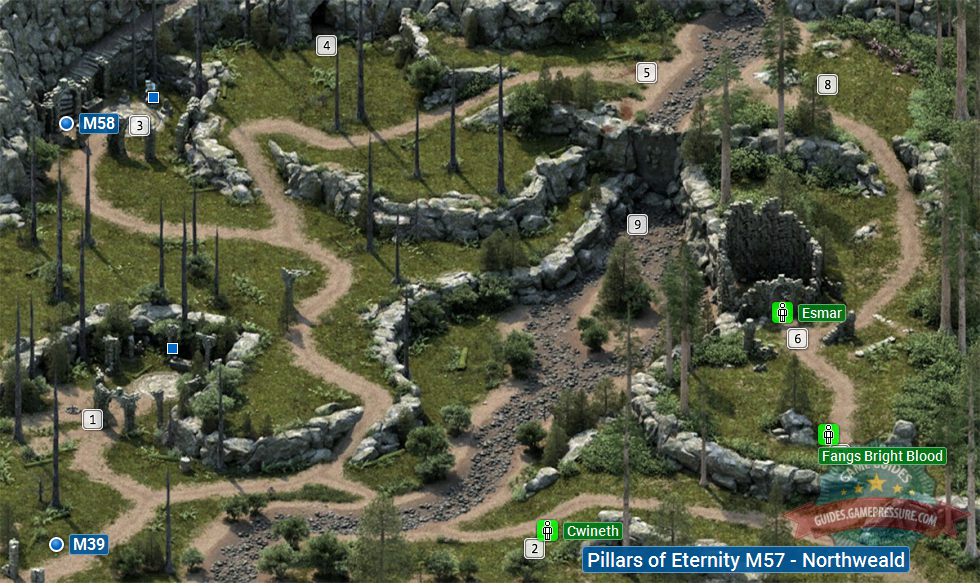 The above map presents Northweald - the location Northwards of Twin Elms. This is the last big location that you visit in this part of the map. Farther northwards, there only is the Temple of Hylea, the stairs to which are in the North-Western part of Northweald. Here, you encounter a wide variety of opponents, the majority of which are connected with the forces of nature, ranging from regular wolves, to the strong forest lurkers.