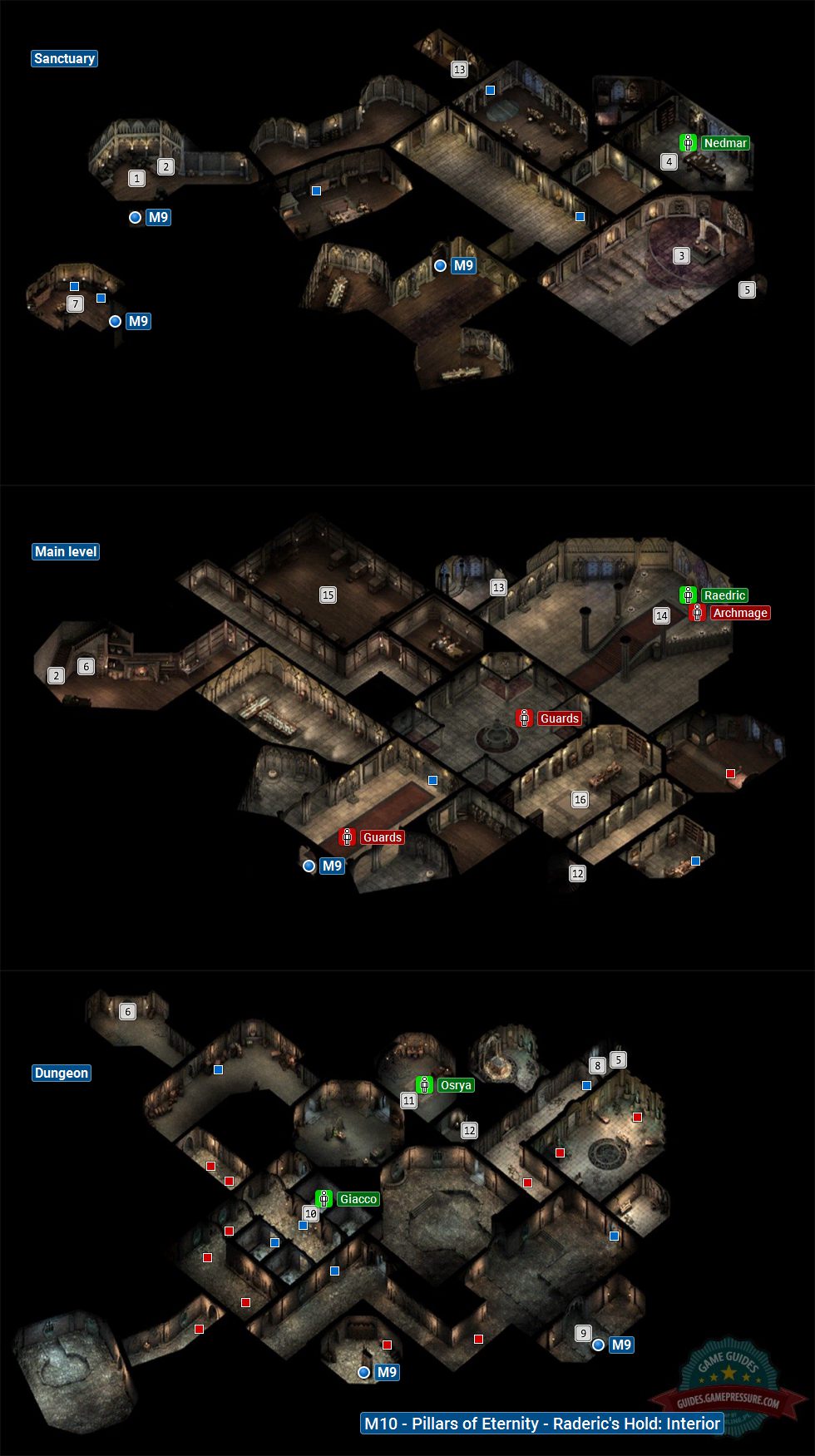 The above map presents the three main levels of Raedric's Hold. These are the Sanctuary, the main level where Raedric himself resides, and the Dungeon where you mostly encounter monsters. You can visit these locations in any order you want and explore them as soon as you get there or once you complete the side quest associated with the hold.