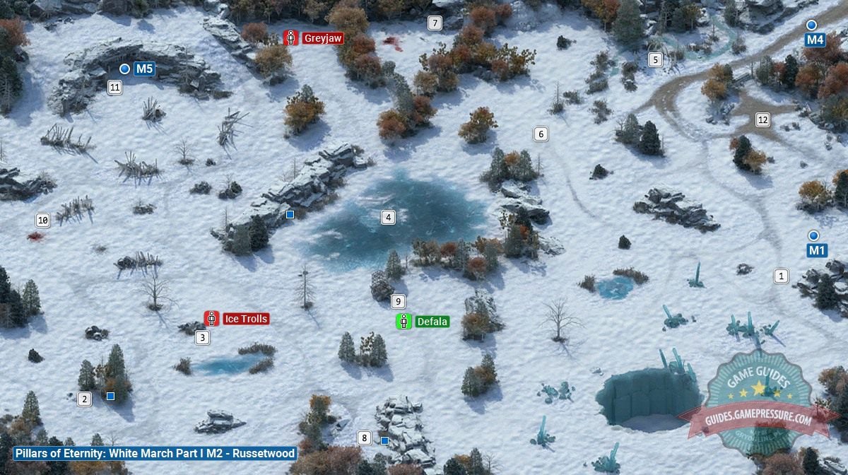 The map above shows the Russetwood, location placed West from the Stalwart village. You won't find any settlements or merchants here, but you will complete here a few quests received in the recently visited village. In the Russetwood you will face many strong opponents, including ice trolls and ogres, often found in large groups. Be cautious when exploring this territory or you might die. The recommended party level for this location is 10. In the north-eastern part of the map you will find a passage to Durgan's battery.