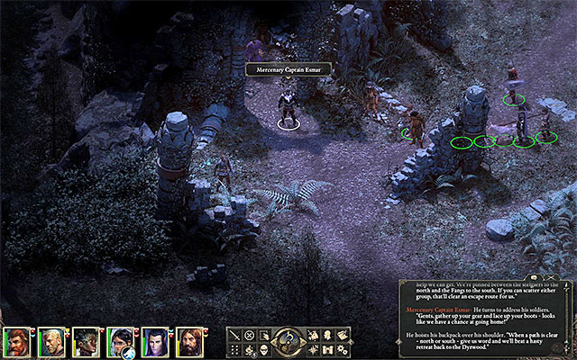 The surrounded mercenaries are by the destroyed tower (M57,6). Here, you need to meet up with Captain Esmar. Also in this case, two options are available - you can either offer to help the mercenaries get out of the plight, or attack them. If you have chosen the former, head South to eliminate the Fangs (M57,7) or North to deal with the monsters on the escape route (M57,8). In the latter case, you would have to defeat a group of spotted stelgaers and you need to watch out the mot for the adult ones, which are the strongest. If you have chosen to attack the mercenaries, after you do, apart from Esmera, deal with the enemy mage and rogue, as quickly as possible. Then, return to the Fangs and report to Bright Fangs Blood about the completion of the task.